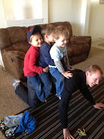 Sometimes Taylor visits us and the boys LOVE it when he is here. He can give them shoulder rides and throw them up in the air which they never get from me since I am weak. If they ever fight or anything he just sends them to me so I get to yell at them, and he looks like the nice guy. I'm pretty sure they just love to torture him, but he is usually a good sport about it.
